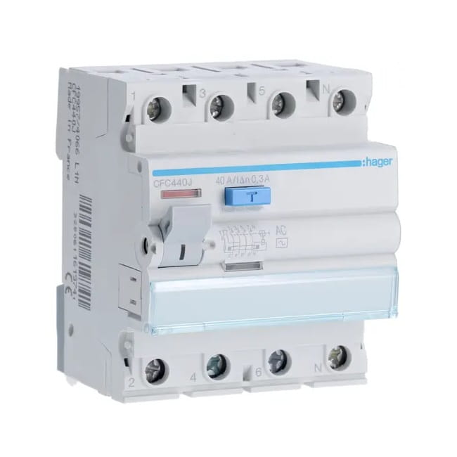 Der Fehlerstromschutzschalter 3P+N 40A 300mA Typ AC CFC440J von HAGER ist ein Gerät, das vor elektrischem Schlag schützt und als zusätzliche Schutzmaßnahme (Schutz bei indirektem Berühren) eingesetzt wird, wenn die grundlegenden Schutzmaßnahmen versagen oder beschädigt werden.